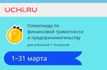 С 1 марта по 31 марта 2022 года на образовательной платформе Учи.ру проходит Всероссийская онлайн-олимпиада «Юный предприниматель и финансовая грамотность» для учеников 1–9-х классов. Проект реализуется Банком России и Ассоциацией развития финансовой грамотности при содействии национального проекта «Малое и среднее предпринимательство и поддержка индивидуальной предпринимательской инициативы» и Минэкономразвития России.