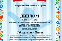 В рамках Всероссийского Социального Проекта “Страна талантов” ученица 3 класса Габидуллина Я. И., ученик 5 класса Шафигуллин А. стали дипломантами Всероссийской предметной олимпиады по английскому языку в 1 потоке. Учитель Мухаметзянова Г.И.