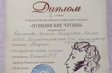 20 марта в Набережных Челнах прошел Всероссийский открытый творческий конкурс "Пушкинские чтения". Кашапова Илина награждена диплом 2 степени. Руководитель Хасанова Р. Г.