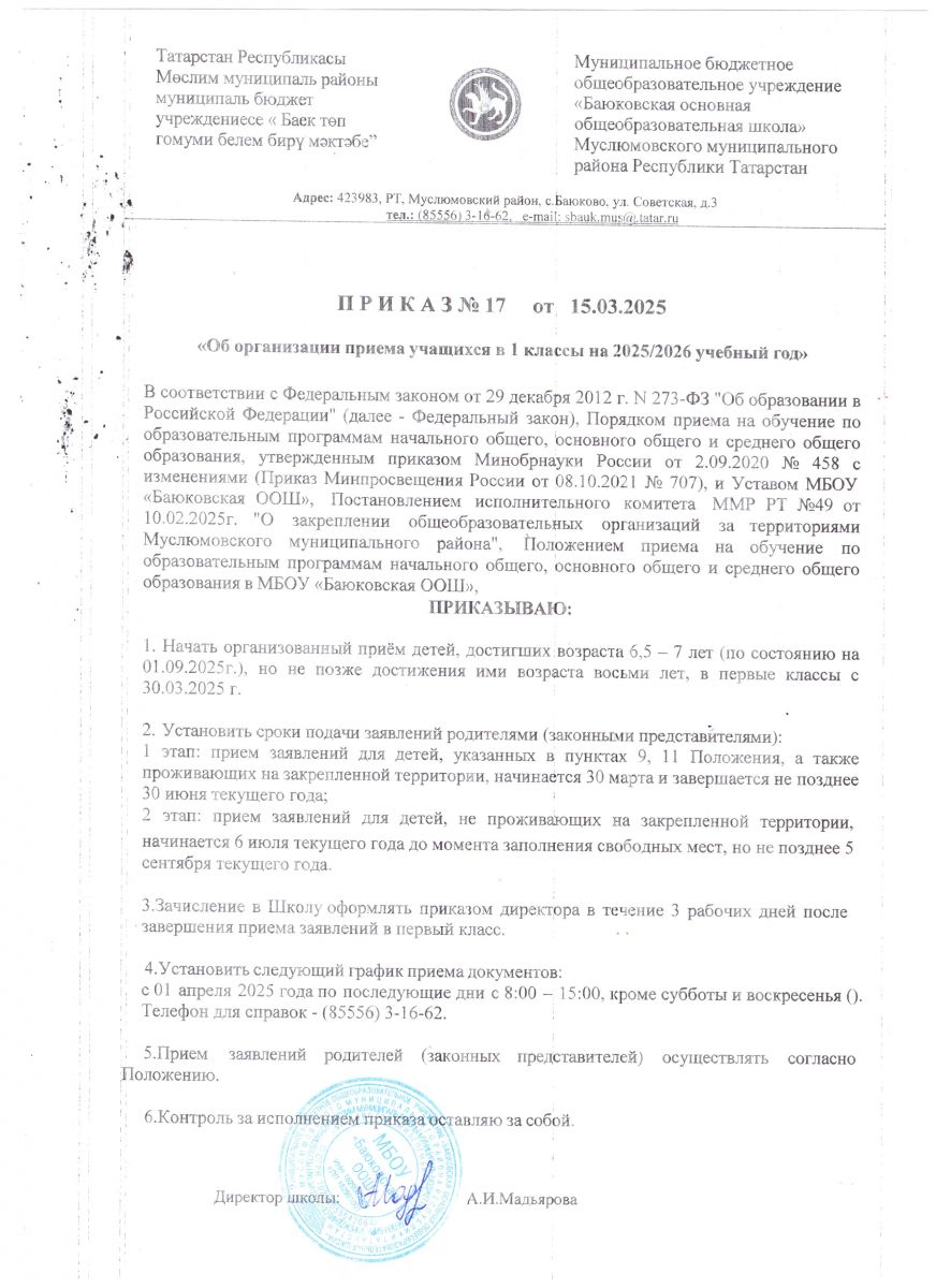 Приказ о начале приема учеников в 1 класс на 2025-2026 уч.год.