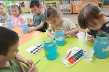 Банкаларны буяу-мавыктыргыч шөгыль кенә түгел, ә интерьерны бизәргә яки оригиналь бүләк булырга мөмкин уникаль декор предметларын булдыру ысулы да. Кече төркем балалары бик мавыктыргыч эш белән шөгыльләнделәр - "Аквариумдагы балыклар". Мондый процесс балаларда төс һәм композиция тойгысын үстерә, шулай ук пөхтә һәм сабыр булырга өйрәтә. Нәтиҗәдә һәр яшь рәссамның индивидуальлеге чагыла торган кечкенә сәнгать әсәренә әверелә.