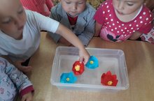 Муслюмовский детский сад "Карлыгач" , дети первой младшей группы, в рамках проекта изучения свойств воды распустили "Цветочки на воде".