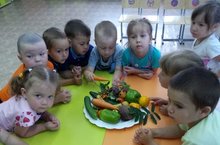 Мөслим "Карлыгач" балалар бакчасының икенче кечкенәләр төркеме. Балалар яшелчә һәм җиләк-җимешләрне төрле билгеләре буенча аерырга өйрәнделәр: кайда һәм ничек үсүен, төсен, формасын, тәмен ачыкладылар.