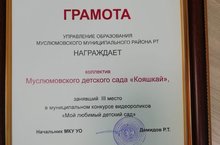 Педагогический коллектив МБДОУ "Кояшкай" принял участие в муниципальном конкурсе видеороликов "Мой любимый детский сад" и был награжден Грамотой МКУ "Управление образования" (3 место).