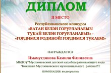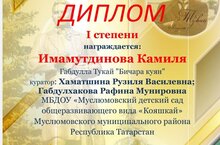 Габдулла Тукай иҗатына багышланган Халыкара шигырь конкурсында катнашып, зурлар төркемендә тәрбияләнүче Имаметдинова Камиля 1 дәрәҗә дипломга лаек булды. Афәрин, Камиля! Котлыйбыз! Әзерләгән тәрбиячеләренә киләчәк эшләрендә дә уңышлар юлдаш булуын телибез!