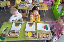 Икенче кечкенәләр төркемендә "Пирамида" темасына кисеп-ябыштыру эшчәнлеге. Шөгыль барышында балаларны уенчык образын тапшырырга, берничә өлештән торган предметны сурәтләргә, детальләрне зурдан кимү тәртибендә урнаштырырга өйрәтү эше алып барыла.