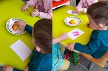 Беренче кечкенәләр төркемендә рәсем эшчәнлеге узды. Шөгыль барышында балаларның сүзлек запасын баету максатыннан җиләк-җимешләр турында әңгәмә үткәрдек. Соңыннан алмалар ярдәмендә кечкенәләр әлеге җимешне рәсемгә төшерделәр.