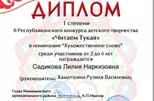 Бакчабызның уртанчылар төркемендә тәрбияләнүче Садикова Лилия республикакүләм "Читаем Тукая" иҗади бәйгесендә катнашып I дәрәҗә дипломант исеменә лаек булды. Лилияне чын күңелдән котлыйбыз. Тәрбиячесе - Р.В. Хаматшинага алдагы эшендә дә уңышлар телибез!