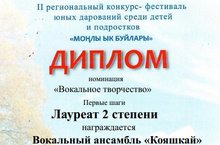 "Моңлы Ык буйлары" II региональ фестиваль-бәйгесендә бакчабызның "Кояшкай" вокаль ансамбле "Вокал" номинациясендә 2 дәрәҗә лауреат дипломы белән бүләкләнде. Ансамбльнең җитәкчесе Алсу Сагдиева.