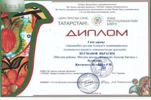 Республикакүләм "Мин яратам сине, Татарстан!" бәйгесендә катнашып мәктәпкә әзерлек төркеме балалары "Аңлашабыз дуслык телендә" номинациясендә төрле дәрәҗәдәге дипломнарга лаек булдылар. Ибраһим Ногманов, мәктәпкә әзерлек төркеме.