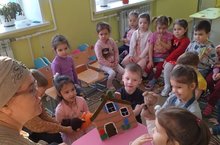 Уртанчылар төркемендә кисеп-ябыштыру шөгылендә балалар бака фигурасын ясадылар. Шөгыль балаларның геометрик фигуралар турында күзаллауларын, бакалар турында белемнәрен киңәйтергә, кызыксынучанлыкларын, иҗади сәләтләрен үстерүгә ярдәм итә.