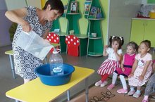 В МДОУ "Кояшкай" в рамках "Неделя познания" воспитатель второй младшей группы Исламова Р.М. вместе с детьми изучают свойства воды.