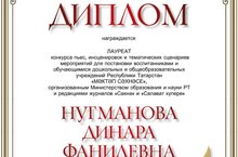Мөслимдәге "Кояшкай" балалар бакчасы тәрбиячесе Динара Ногманова ТР Мәгариф һәм фән министрлыгы, "Сәхнә" һәм "Салават күпере" журналлары редакцияләре үткәргән "Мәктәп сәхнәсе" бәйгесендә катнашып лауреат исеменә лаек булды һәм Диплом белән бүләкләнде.