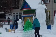 Коллектив Муслюмовского детского сада "Кояшкай" украшает территорию детского сада к Новому году разлиными снежными персонажами из сказок.