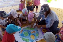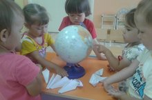Беренче кечкенәләр төркеме глобус белән танышты...һавада самолет,диңгездә кораб белән йөзеп булганын белделәр.