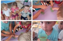 Зурлар төркемендә су белән тәҗрибәләр үткәрдек. "Суның төсен үзгәртеп буламы? Ул нинди ?(Сыекмы, куемы, кайнармы , салкынмы). Аның тәме, исе бармы ?" дигән сорауларга җавап бирдек .