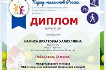 Безнең балалар бакчасы тәрбиячесе Хәлиуллина Нәфисә Ирхат кызы "Юл йөрү кагыйдәләрен мин беләм, мин аларны үтим!" исеме астында үткән халыкара конкурста катнашып 2 дәрәҗә дипломга ия булды.