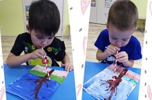 На занятии рисования дети познакомились с новым видом нетрадиционной техники рисования "Кляксография" (выдувание из трубочки) и, применяя этот метод, нарисовали "Осеннее дерево".