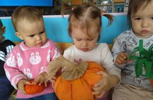 С детьми второй группы раннего возраста в процессе ознакомления с окружающим миром беседовали на тему "Осенняя природа". Затем приклеивали листья к ежу-дуге.