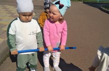 Беренче кечкенәләр төркеме балалары белән саф һавада физик күнегүләр ясыйбыз. Көн саен бакча тирәли әйләнеп, сәламәтлекне ныгытабыз, парлап һәм таякка тотынып йөрергә өйрәнәбез.