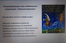 Балалар яңа әкиятләр тәкъдим иткән "Сәяхәтче" мобил Планетарийның тулы куполлы шоуын карадылар, анда балалар галәмнең төзелеше, йолдызлар, планеталар турында белделәр, әкиятләр каһарманнары белән бергә кызыклы космик сәяхәттә булдылар.