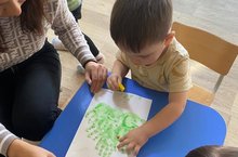 В первой младшей группе рисование. Дети своими руками сделали елку и украсили ее пластилином. Это повышает мышление детей, придает большое значение развитию моторики рук.