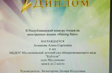 "Күбәләк" балалар бакчасында тәрбияләнүче Асманова Алисә "Shining Stars"дип исемләнгән республикакүләм чит телләрдә нәфис сүз осталары бәйгесе призеры булды. Аңа киләчәктә дә уңышлар телибез.