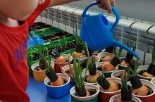 Зурлар төркеме балалары үзләре утырткан суганнарга су сибәләр, үскәннәрен күзәтәләр.