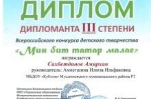 Воспитанник старшей группы Башаров Азамат стал дипломантом 3 степени Всероссийского конкурса детского творчества "Мин бит татар малае", организованного МКУ "Управление образования Исполнительного комитета Елабужского муниципального района"