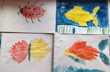 Беренче кечкенәләр төркемендә көз фасылы белән таныштык, көзнең билгеләрен белдек, төсләрне кабатладык. Мамыклы таякчыклар һәм гуашь ярдәмендә көзге матулыкны плакатка төшердек, клей ярдәмендә көзге яфракларны ябештердек.