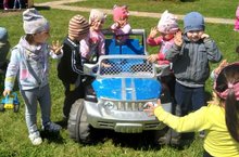 Дети второй младшей группы, во время прогулки знакомятся с частями машины. Учатся уступать друг- другу, ведь каждому хочется быть шофером.