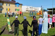 Мәктәпкә әзерлек төркеме балалары саф һавада "Ал кирәк, гөл кирәк" җырлы- биюен уйнап күңел ачалар.