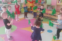 Физкультура в первой младшей группе вместе с флажками. Выполнять упражнения вместе с воспитателем, упражнять в беге, в умении действовать по сигналу. Развивать координацию движения. Воспитывать желание выполнять физические упражнения.