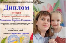 Воспитанница старшей группы Харитонова Сюмбель стала победителем во Всероссийском творческом конкурсе «8 марта мы дарим мамочкам подарки!» и получила диплом I степени. Поздравляем с Победой музыкального руководителя Заянову Лилию Рафисовну и воспитанницу Харитонову Сюмбель! Желаем дальнейших творческих побед и успехов! Мы гордимся вами!!!