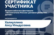 Воспитанники нашего детского сада под руководством воспитателя Халиуллиной Алсу Ильдусовны приняли активное участие во Всероссийском фестивале "Воспитатели России: речевое развитие детей". Алсу Ильдусовна награждена сертификатом участника, а воспитанники стали обладателями дипломов чемпиона