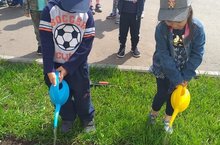 Дети детского сада вместе с воспитателями посадили цветы. Они каждый день ухаживают за ними.