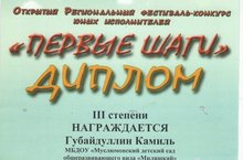 Губайдуллин Камиль участвовал в открытом региональном фестиваль-конкурсе юных исполнителей "Первые шаги" и получил диплом III степени в номинации "Вокал-соло".