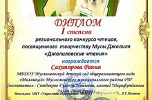 Муса Җәлилнең туган көне уңаеннан үткәрелгән “Җәлил укулары” регионль конкурста катнашып балаларыбыз 1, 2 дәрәҗә дипломнар белән бүләкләнделәр. Барысыда уңышлы чыгыш ясадылар.