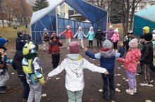 Подготовительная к школе группа весело проводит время на свежем воздухе, играя в подвижные игры.