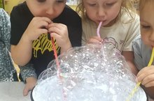 "Күбекле сарай" тәҗрибә уены. Максат: бер тамчы сабынлы суга һава өрсәң куыклар, аннары күбек барлыкка килүе белән таныштыру. Балалар тәҗрибәле уен барышын зур кызыксыну белән күзәтәләр, анда бик теләп катнашалар. -