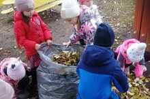 Уртанчылар төркемендә хезмәт тәрбиясе. Балалар өлкәннәргә көзге яфракларны җыярга булыштылар.