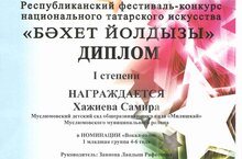 Воспитанница старшей группы Хазиева Самира под руководством Заяновой Ландыш Рафисовны приняла участие в республиканском конкурсе "Бәхет йолдызы" и была награждена дипломом 1 степени в номинации "Вокал-соло". От всей души поздравляем с этими успехами.