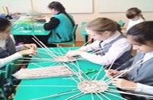 "Мастерилка" остаханәсендә шөгыльләнүче укучылар газета ярдәмендә кәрзинншәр урергә өйрәнәләр./ Плетение из газетных трубочек