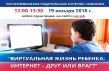 ДОРОГИЕ РОДИТЕЛИ!!! Завтра, 19 января 2018 года в 12 часов состоится третье заседание Республиканского родительского интернет-собрания, посвященное вопросам информационной безопасности детей. Данный проект – совместная инициатива Министерства образования и науки Республики Татарстан и Общественного совета при Министерстве образования и науки Республики Татарстан.Тема заседания – «Виртуальная жизнь ребенка: Интернет – друг или враг?» Онлайн-трансляция будет вестись с 12.00 до 13.30 на данной странице. В процессе трансляции слушатели смогут получить ответы на заранее присланные вопросы. Вопросы принимаются: с помощью формы на сайте ЗАДАТЬ ВОПРОС и по адресу электронной почты roditelirt@mail.ru