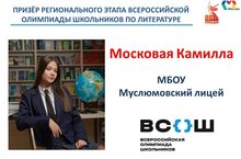 Ученица 9б класса Московая Камилла- призёр регионального этапа Всероссийской олимпиады школьников по литературе.Учитель- Фазилова Светлана Викторовна. Поздравляем!