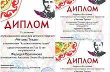 Учащаяся 1в класса Фарида Ибрагимова награждена дипломом I степени II Республиканского конкурса детского творчества "Читаем Тукая" в номинации "Художественное слово"