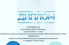 11 сыйныф укучысы Хантимерова Камилә КФУның "Чит тел (Инглиз теле)" һәм "Рус теле" профильләре буенча төбәкара фән олимпиадаларының сайлап алу этабы призеры һәм җиңүчесе 18.01.2022