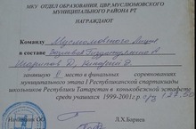 На основании приказа МО и Н РТ №497/13 от 30.12.2013 г. учителю математики Галимовой Л.И. присвоена высшая квалификационная категория. Первая квалификационная категория присвоена: учителю физкультуры Арсланову Ф.А., учителю информатики Галеевой Г.М., учителю английского языка Нуриевой Л.Л., учителю физики Хакимовой З.З., учителю ОБЖ Хатбуллину Т.Л., учителю начальных классов Шаймардановой Л.Я. Поздравляем, желаем дальнейших творческих успехов в работе!