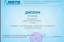 Ученик 11а класса Харисов Равиль удостоился Диплома 3 степени в заочной олимпиаде по математике, проведенной Московским физико-техническим институтом. Его пригласили в Москву на очный тур. Учитель Зиннатуллина Р.З. Поздравляем!