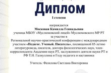 На базе филологического факультета НГПУ в рамках Года педагога и наставника прошла региональная научно-практическая конференция с международным участием «Педагог. Ученый. Писатель», посвященная 85-летию литературоведа, народного писателя Т.Н. Галиуллина. В работе НПК приняли участие ученицы 8 б класса МБОУ Муслюмовский лицей Московая Камилла и Мкртчян Светлана с исследовательскими работами по языкознанию и литературе. По итогам конференции Московая Камилла награждена дипломом 1 степени, Мкртчян Светлана удостоилась диплома 2 степени. Научный руководитель учениц – учитель русского языка и литературы Фазилова Светлана Викторовна